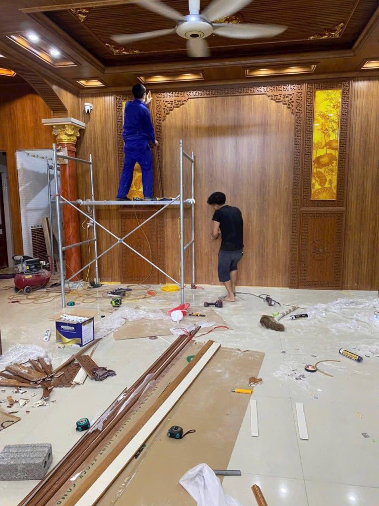 - Thi công toàn diện: Trần nhựa Nano, tấm ốp lam sóng giả gỗ, trần thả nhựa PVC.