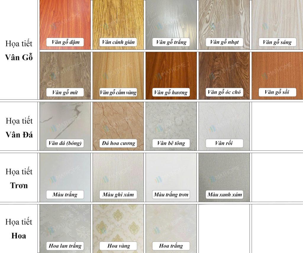 - Vân gỗ (Giả gỗ): Đây là loại phổ biến nhất, mô phỏng các loại gỗ tự nhiên từ màu sáng đến màu tối, phù hợp với nhiều phong cách nội thất khác nhau.
