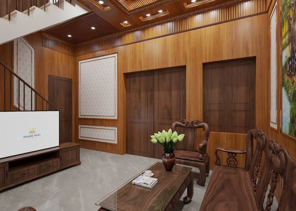 - Trang trí tường đối diện sofa: Tạo không gian ấm cúng, sang trọng với các tấm ốp có họa tiết vân gỗ chân thật.